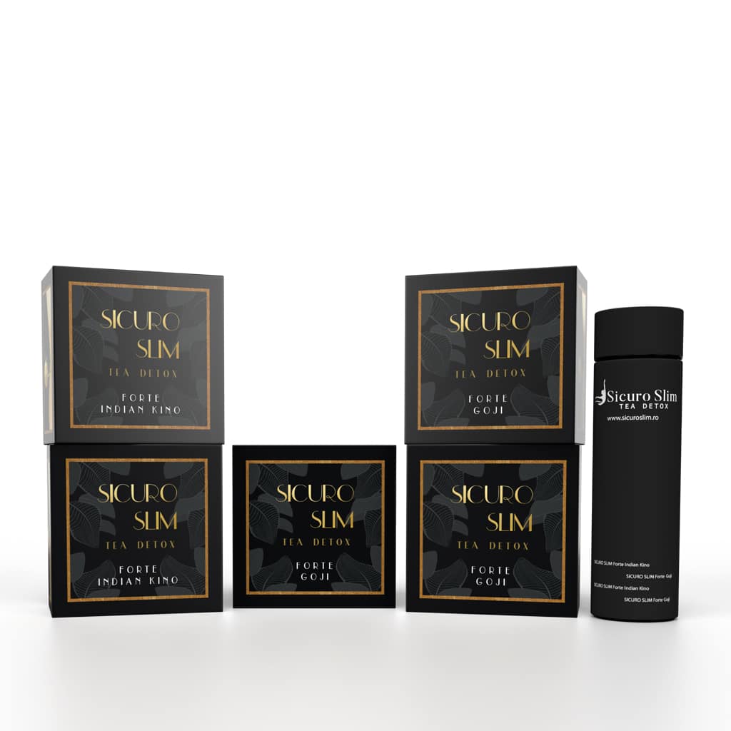 COMPONENTELE CEAIURILOR SICURO SLIM FORTE GOJI si SICURO SLIM FORTE INDIAN KINO   Frunzele de Goji au un aport de nutrienți foarte ridicat în antioxidanți naturali, reduc colesterolul și hipertensiunea arterială, scad efectul de constipație, dureri abdominale și arsuri la stomac și ajută la îmbunătățirea circulației sângelui.  Frunzele de Ceai Verde oferă organismului efecte stimulante, deţin efecte calmante asupra sistemului nervos, elimină toxinele și contribuie la distrugerea bacteriilor ce pot provoca intoxicaţii alimentare.  Florile de Hibiscus menţin tensiunea arterială în limite normale, elimină lichidele reţinute în exces în corp, menţin sănătatea aparatului respirator și protejează celulele împotriva stresului oxidativ.  Fructele de Coriandru susțin digestia, contribuie la o funcţionare normală a aparatului digestiv, stimulează secreţia sucurilor gastro-intestinale și ajută la eliminarea gazelor intestinale. Bucățile de Măr au nivel crescut de antioxidanți și reglează nivelul glicemiei. Florile de Soc au proprietăţi antioxidante, scad nivelul de colesterol, îmbunătăţesc vederea, stimulează sistemului imunitar și îmbunătăţesc sănătatea inimii.  Frunzele de Afin detoxifică tractul intestinal, menține nivelul glucozei din sânge, protejează şi regenerează vasele capilare sanguine din piele şi retină.  Rădăcina de Ghimbir stimulează funcția digestivă, are efect antioxidant și energizant, ajută la scăderea colesteroluluii și contribuie la reducerea inflamațiilor. Frunzele de Senna au proprietăți detoxifiante, puritificatoare, vermifuge la nivel intestinal, laxative și purgative. Frunzele de Roiniță reduc spasmele intestinale, stimuleză producerea şi eliminărea de bilă și reduc stările de greaţă.  Frunzele de Dud au proprietăți ușor hipoglicemiante, astringent-antiseptice, ușor diuretice și remineralizante. Frunzele de Rozmarin au proprietăţi antioxidante, oferă suport pentru funcționarea normală a ficatului și bilei și contribuie la obținerea confortului digestiv. Ceaiul Negru protejează sistemul digestiv, are proprietăți antioxidante, elimină radicalii liberi și încetinește procesul de deteriorare celulară. Fructele de Agriș stimulează tranzitul intestinal și mențin sănătatea sistemului digestiv îmbunătățesc capacitatea organismului de a absorbi nutrienții din alimente și stimulează receptorii de gust. Cafeaua Verde ajută în lupta cu kilogramele în plus, împiedică acumularea depozitelor de grăsime, suprimă apetitul, reducând poftele și scade nivelul de colesterol din sânge. Lemongrass-ul reduce colesterolul rău, detoxifică organismul, ameliorează afecțiunile digestive și tratează infecțiile. Florile de Tei au proprietăţi neurosedative şi antispastice, au efect diuretic şi ajută la eliminarea retenţiei de apă din organism, cresc uşor temperatura corpului și ne scapă de toxinele din corp. Florile de Hibiscus menţin tensiunea arterială în limite normale, elimină lichidele reţinute în exces în corp, menţin sănătatea aparatului respirator și protejează celulele împotriva stresului oxidativ. Fructele de Măceș sunt un excelent vitaminizant natural, cresc rezistenţa capilarelor sanguine și au proprietãţi astringente, antidiareice și diuretice. Fructele de Aronia sunt un antioxidant puternic care ajută la eliminarea radicalilor liberi existenți în sânge, în piele, țesuturi și organe, prevenind mutațiile care pot să apară. Bucățile de Mango ajută la menţinerea unui nivel scăzut al glucozei și păstrează un tract digestiv sănătos.  Frunzele de Dud au proprietăți ușor hipoglicemiante, astringent-antiseptice, ușor diuretice și remineralizante.  Bucățile de Ananas au proprietăţi antiinflamatorii, purgative, detoxifiante, antidepresive şi are efect revigorant.  Bucățile de Scorțișoară au proprietăţi antioxidante, antiinflamatoare, antifungice, antiseptice, antimicrobiene, antivirale, anticancerigene, ciatrizante, revigorante, antispastice, antihipertensive şi întăresc sistemul imunitar.